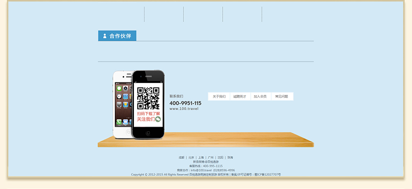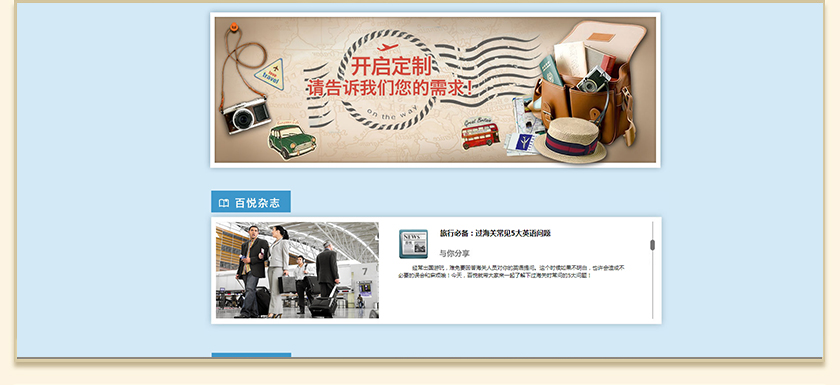 Project Description 百悦逸游于2012年初由二位资深的旅行家创办,是成都传媒集团旗下成都新闻国际旅行社有限公司的高端旅游品牌,总部位于成都高新区天府大道中段美年广场。在百悦逸游成立之前,创始团队亲自到全球三十多个国家实地考察,带着第一手的资讯和执着的信念创立了中国西部第一家真正意义上的私人定制旅行机构。百悦的旅行不是跟团挤大巴,不是十天去十个国家,更不是没完没了的... Official website address 雅安http://www.100.travel I want to share